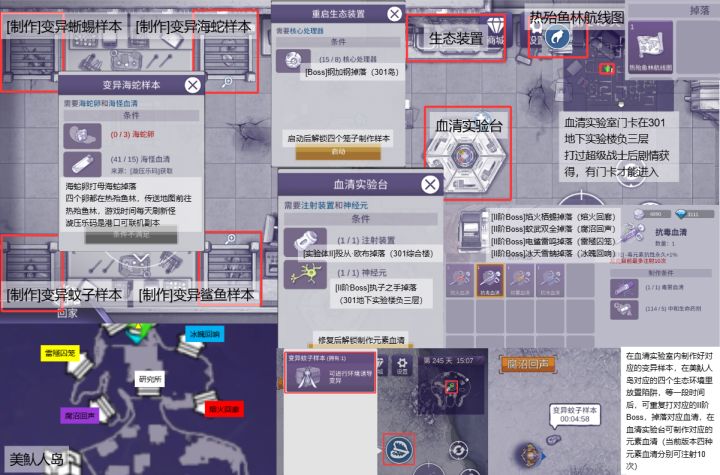 ⑤变异样本在美魜人岛四个生态环境内放置陷阱,等生物变异为II阶Boss,打怪掉血清(可重复放置陷阱,一直放一直打);
