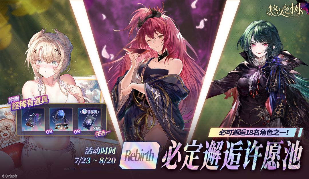 为庆祝悠久之树日服将于近日上线,「Rebirth」必定邂逅许愿池限时开放!在该许愿池内许愿时,探求者大人可以从指定的18位限定SSR角色中选择1位,10次许愿内必定邂逅所选的角色!且可额外可获赠限定礼物【奇珍秘宝自选箱Ⅰ*1】,使用后可自选获得【极致的证明*1】【箱庭奏者*1】【万灵许愿签*60】中的任意一种礼物!