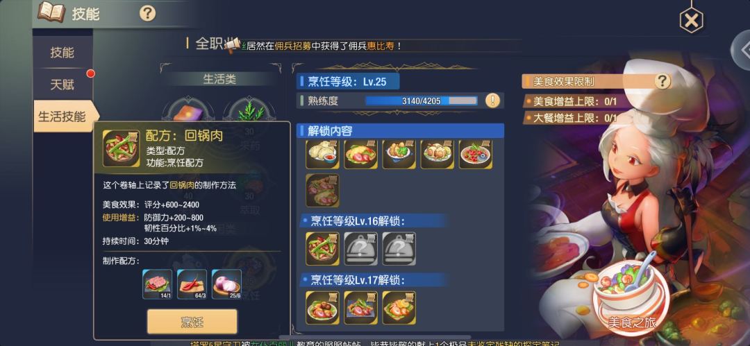 通过制作回锅肉,可以将烹饪等级直接提高到20级!家人们,你们这时候已经从厨艺小白,变成了厨艺高手,接下来推荐完成美食之旅任务。