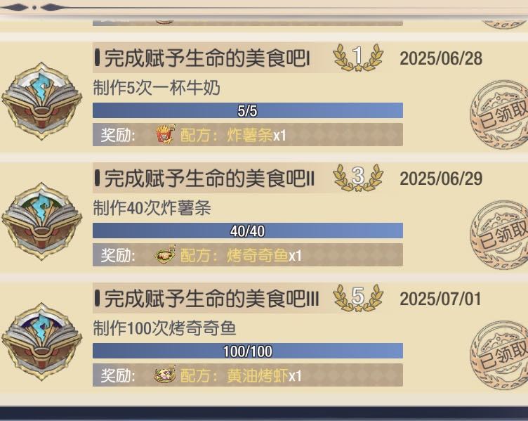 在完成40个炸薯条后可获得菜谱【烤齐齐鱼】。如果在这之前囤积了比较多的齐齐鱼以及食材自选箱后,就可以一口气制作100个烤齐齐鱼,并获得菜谱黄油烤虾。这时候不要着急去制作黄油烤虾,因为你的烹饪等级已经来到了15级,而15级后就可以开始制作一些猪肉的料理。