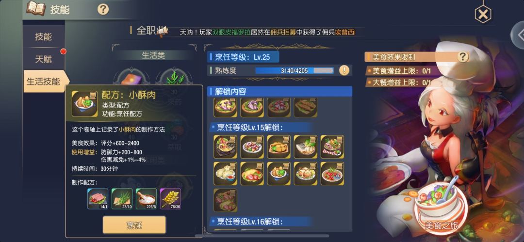 为了不被卡等级,提供一套快速提升烹饪等级的做法。在初期的时候可以快速的通过一些简单的食材将烹饪等级提高至4级。