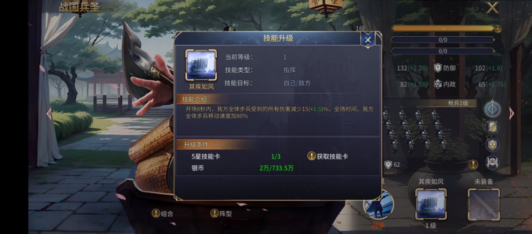 技能:开场8秒内,我方全体步兵受到的所有伤害减少15(+1.5)%。全场时间,我方全体步兵移动速度增加80%。