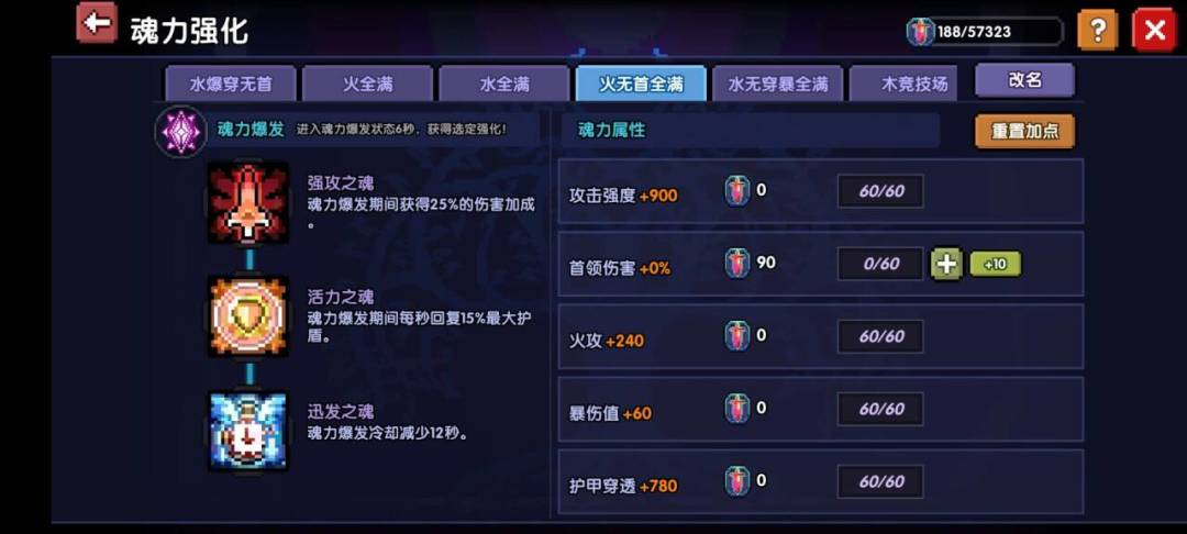 属性方面先点满穿透、暴击、点爆伤、火攻,攻强和无限攻强8:3分开点即可。首伤不用点。