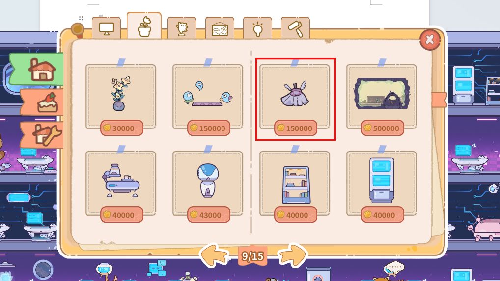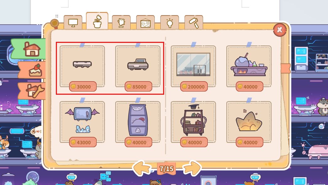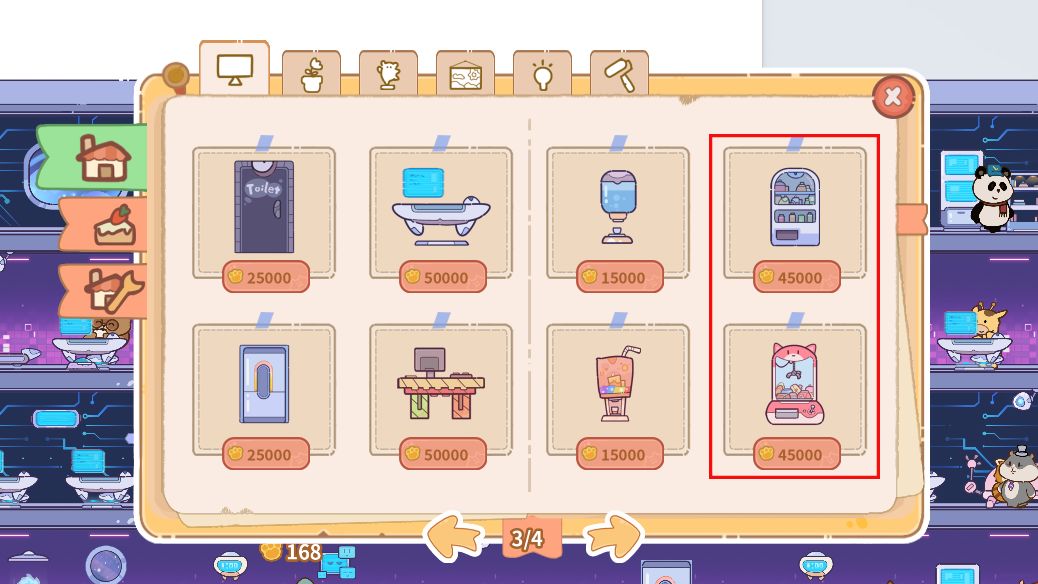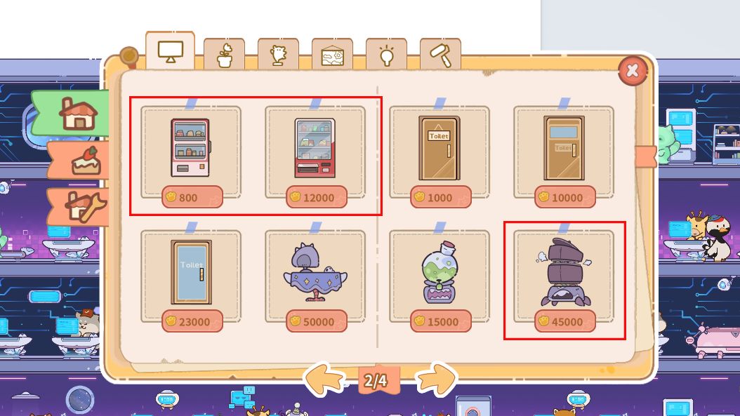 看到有些老板们的反馈说,不太清楚自动投喂食物的自动贩卖机和自动清洁的扫地机器人有哪些。我们就为各位老板标注出以上两类功能性家具。老板们只要购买这些家具,就可以实现自动化管理公司啦~