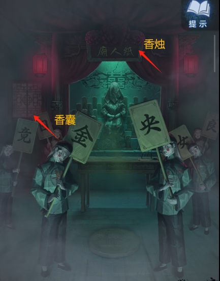更多解谜游戏攻略持续更新中,欢迎点赞关注啵啵~~~①:纸人庙牌匾上方拿到龙凤花烛,左边的门后边可拿到朱砂香囊