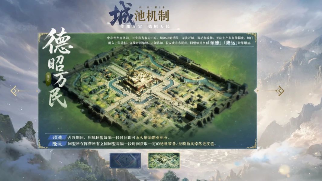 「隆运」:同盟所在阵营所有立国同盟每隔一段时间获取一定的绝世装备/坐骑拍卖掉落进度值。(当积累进度值达成后,下次拍卖额外掉落一件绝世装备或坐骑)