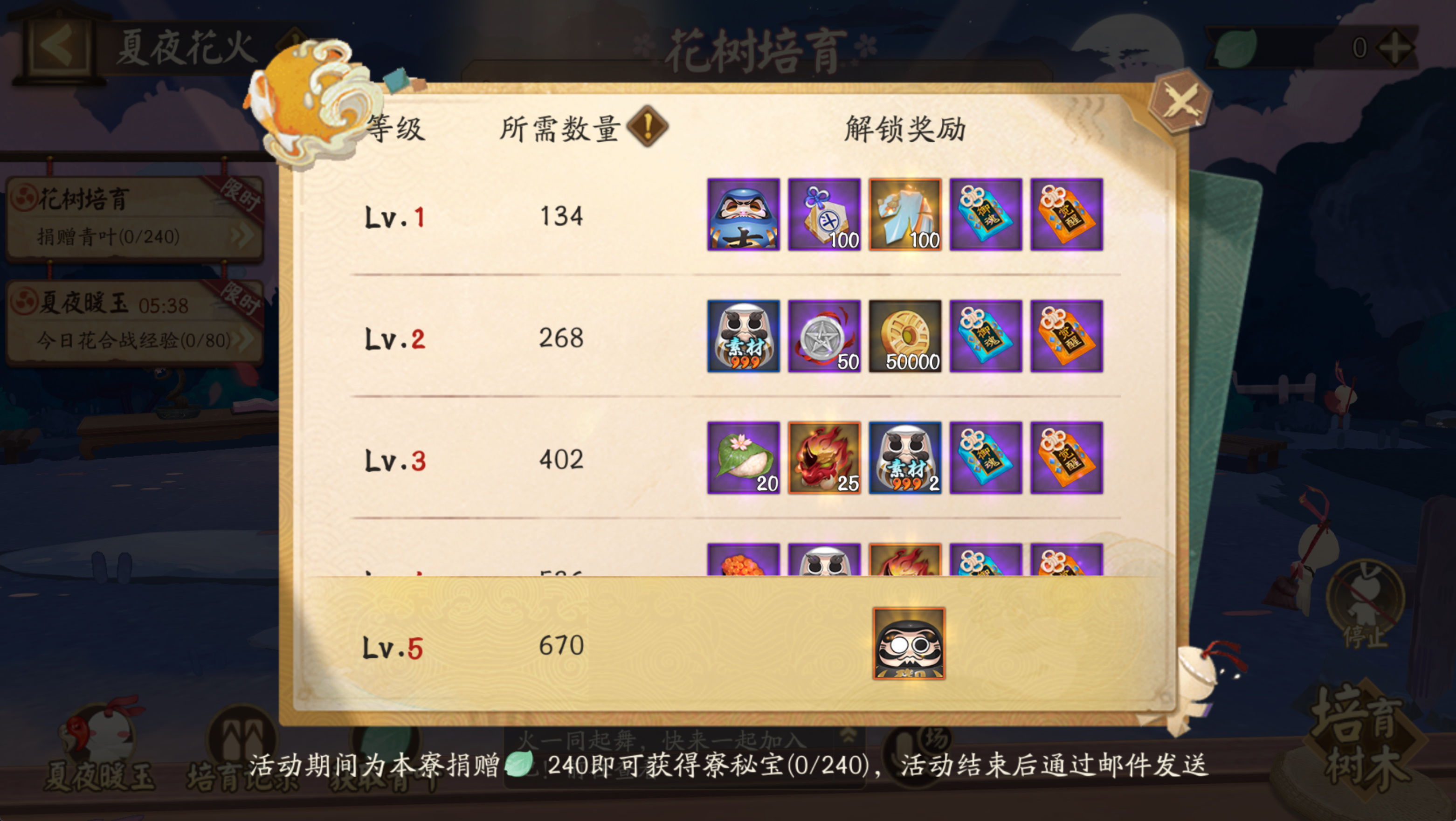 活动期间,大人至少向同一个阴阳寮捐赠240个「夏夜青叶」,才能获得对应等级的寮秘宝奖励。