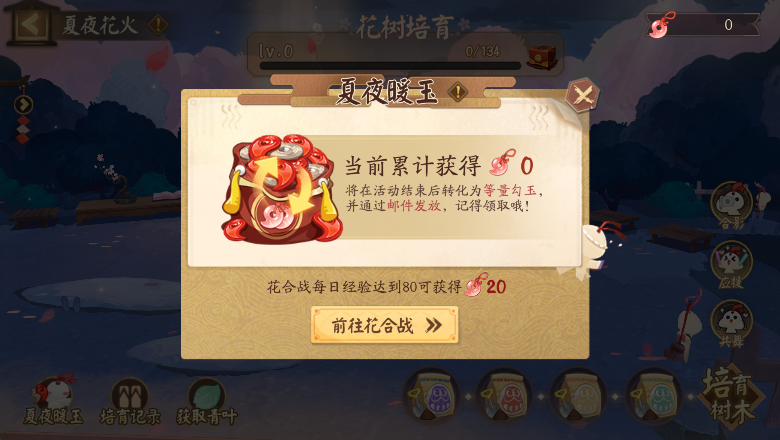 大人通过每日花合战任务可获取「夏夜暖玉」,累积的「夏夜暖玉」将在活动结束后转化为相同数量的勾玉。