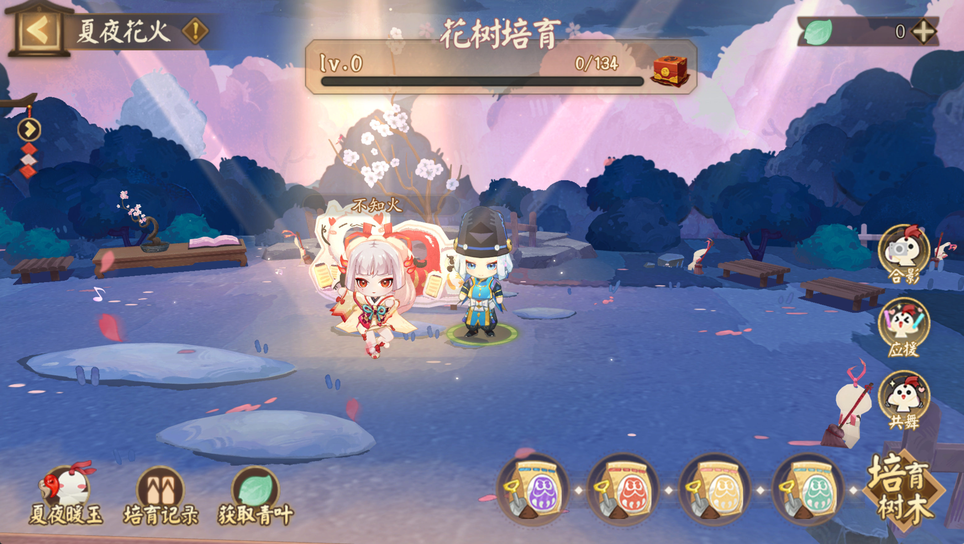 活动期间,大人完成日常玩法可获得「夏夜青叶」。去往寮境内花树附近区域,选择「永恒养料」、「赤霄养料」、「光辉养料」、「常青养料」四种养料中任意一种,并捐赠「夏夜青叶」,即可获得培育奖励并与寮友们共同提升花树的等级,解锁御行达摩、四星奉为达摩等寮秘宝奖励。