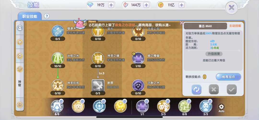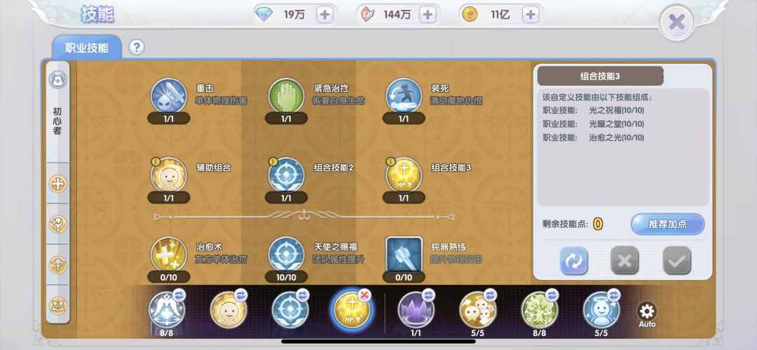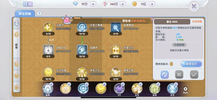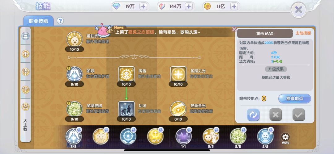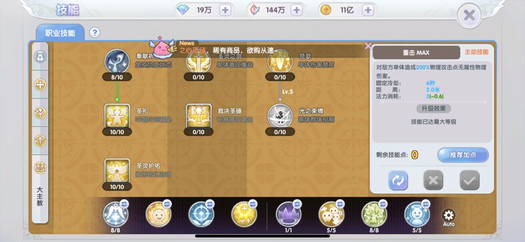 光耀之堂:在四方格内每0.5秒为队友恢复(130%魔法攻击+240)点生命值,同时对不死系、恶魔系怪有效,兼具攻击与辅助功能,点满。
