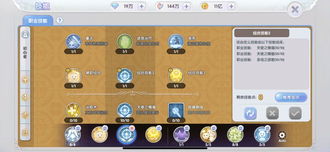 天使之护:降低受不死系、恶魔系伤害20%,提升对其30%伤害,技能充足时点满。
