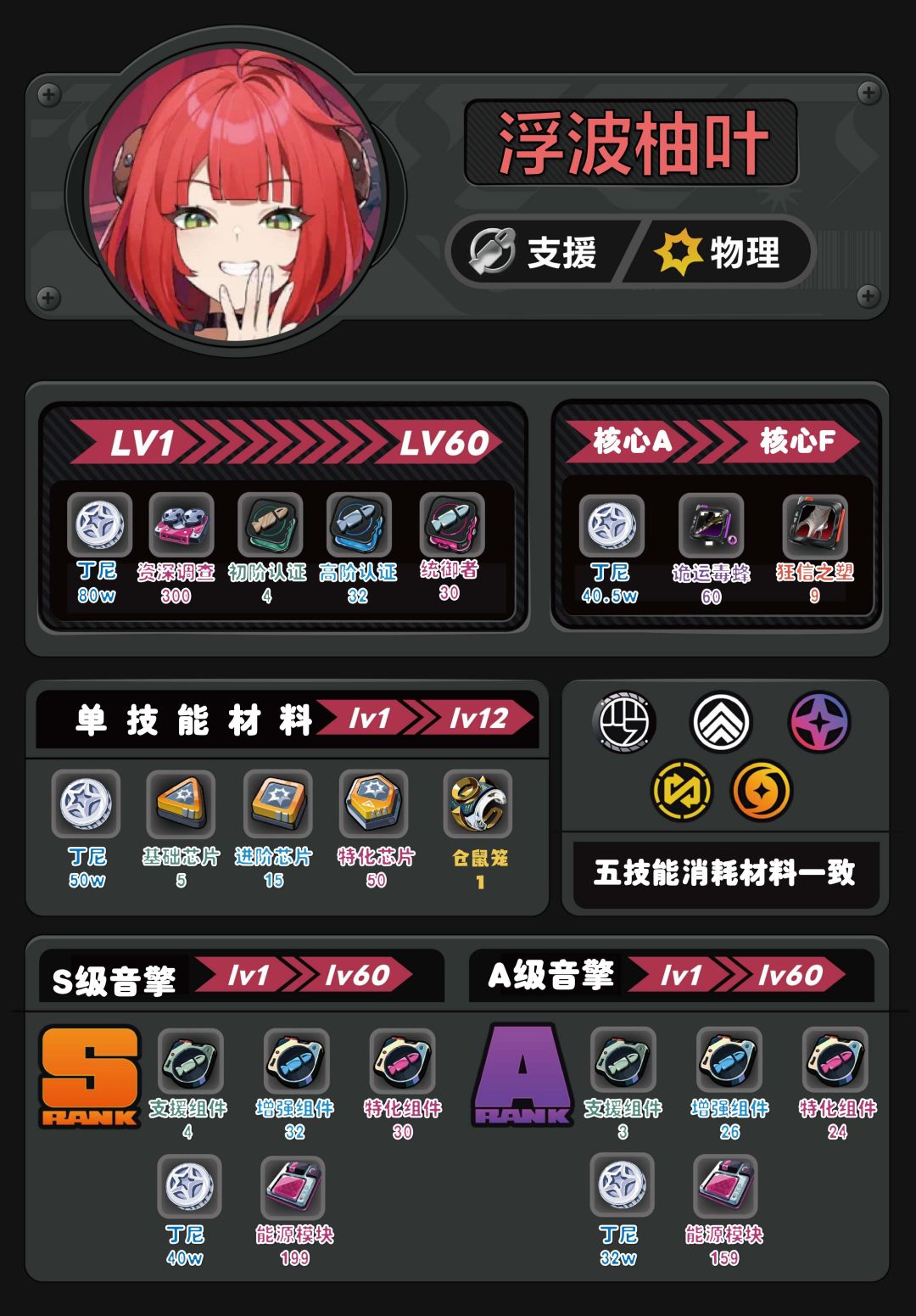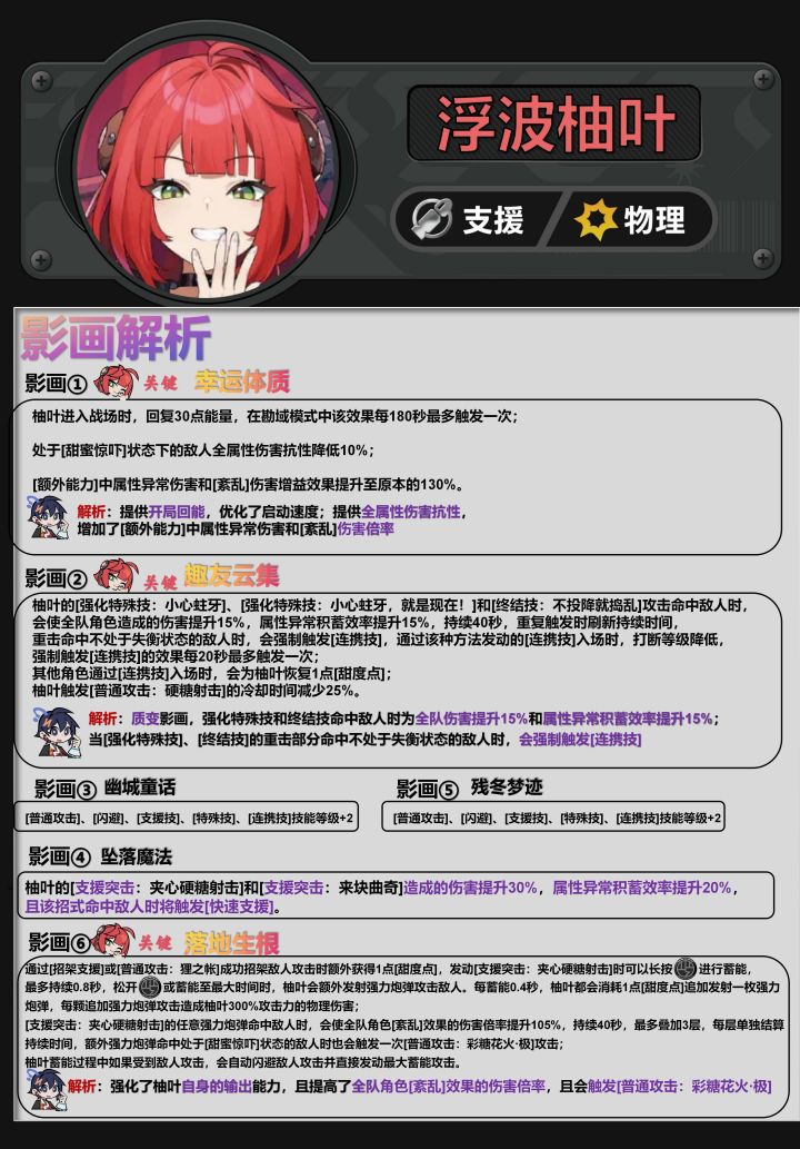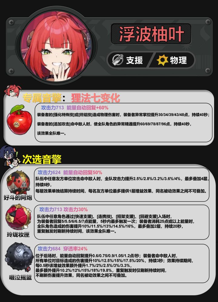 浮波柚叶是S级异常体系专属辅助的【支援】物理属性代理人,通过独特的「染色」机制可配合异常C加速异常积蓄效率,可为全队带来攻击力、异常属性和紊乱伤害的增幅,且自身不会参与异常伤害结算,不会稀释主C的伤害。