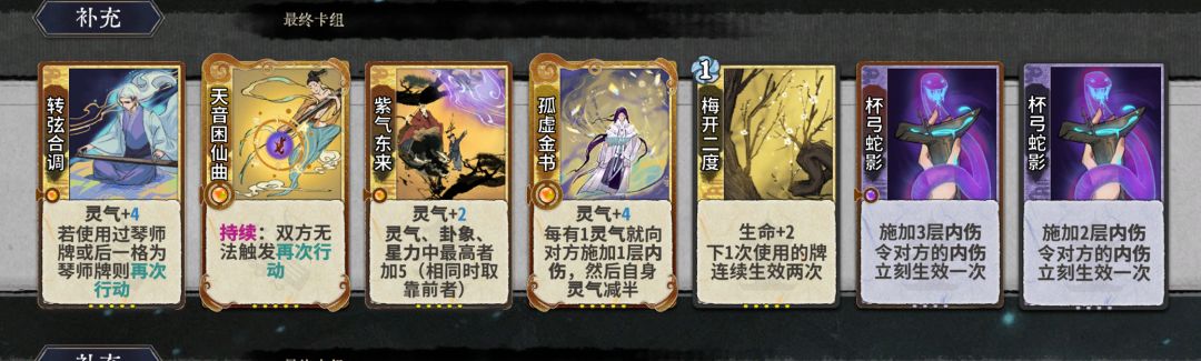 最终卡组分为两套,一套毒,一套梅开六爻,流水无情仅为过度卡。
