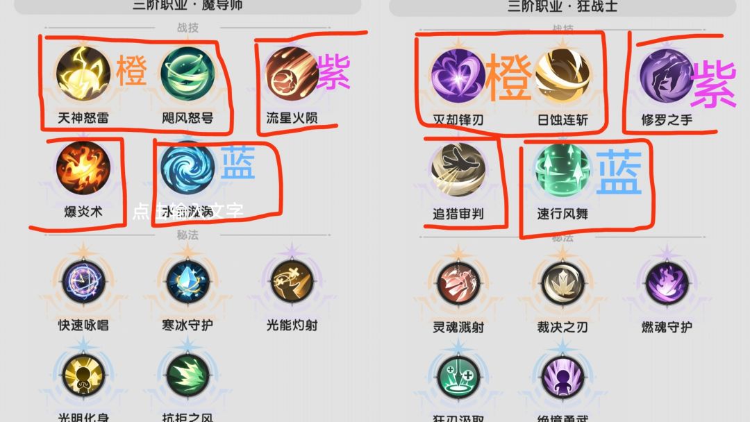 我们再来看看其他技能。由于考虑到四转斗士为元素斗,灭却锋刃是推图PK都有用的核心技能,所以看灭却的星级,方案二最低,排除掉方案二。