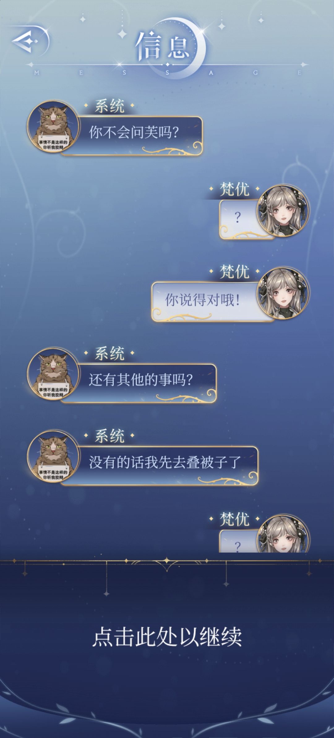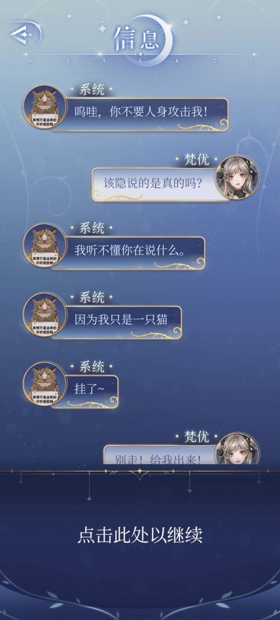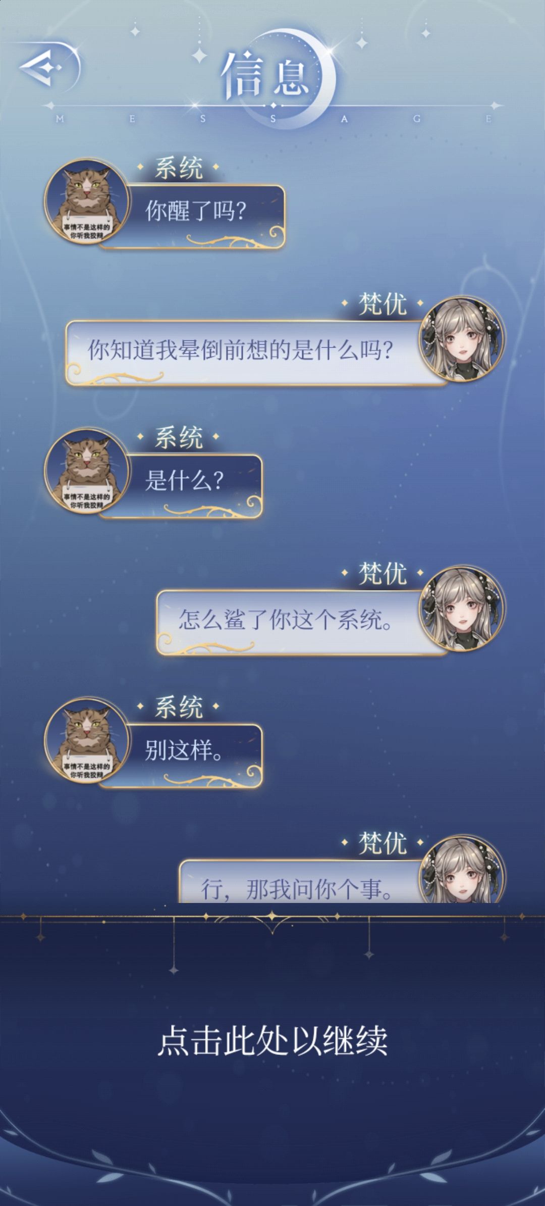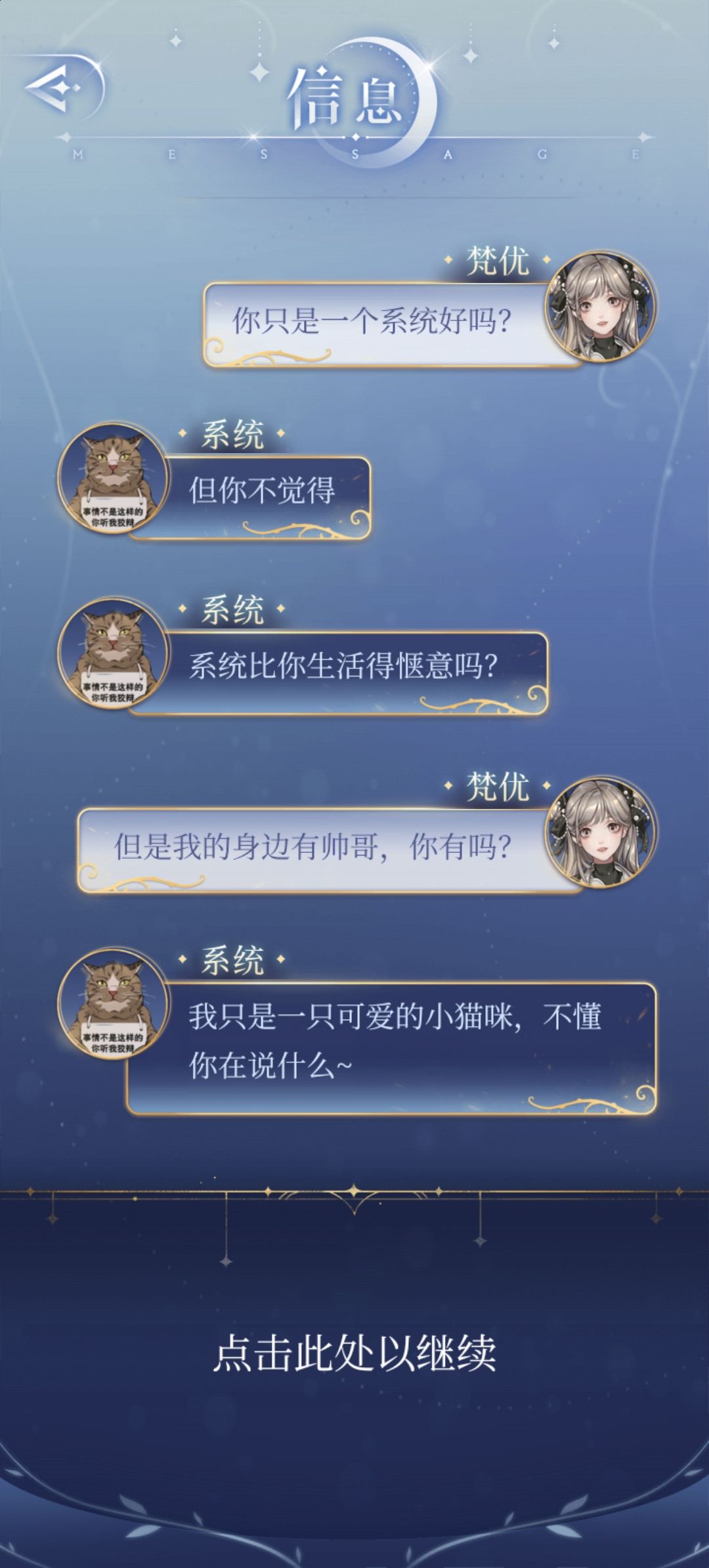 梵优经常调侃系统,比如称呼它为“破猫”、“骗子猫”,甚至质疑它作为系统的合法性(“你只是一个系统好吗?”)。系统则以幽默和略带吐槽的方式回应,比如自称“可爱的小猫咪”,或者用哲学系毕业的背景来回击梵优的质疑。这种互相调侃的模式是他们互动的主要形式,充满了轻松和幽默。