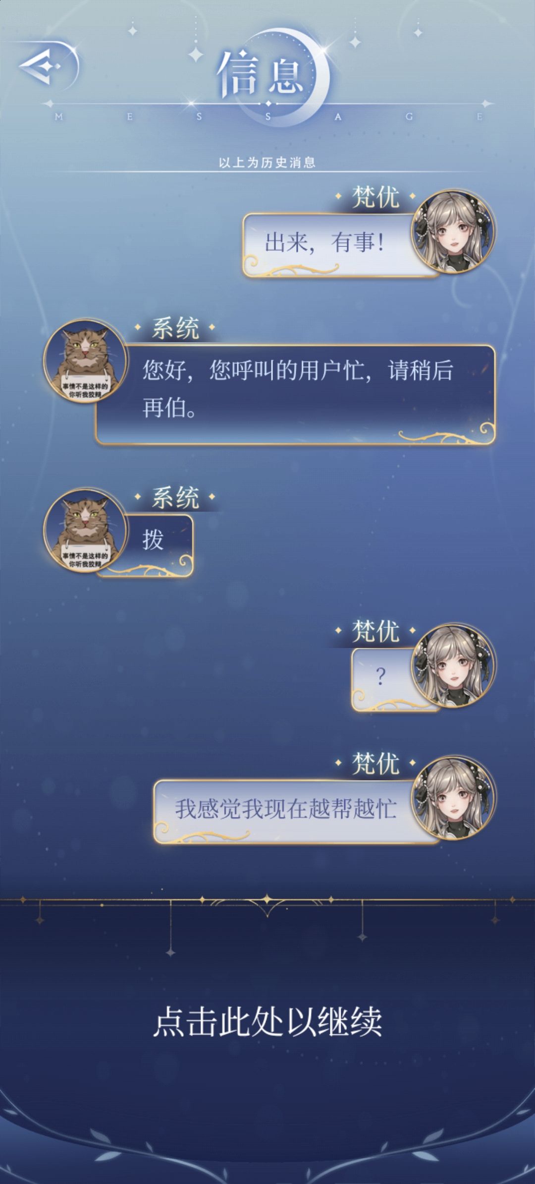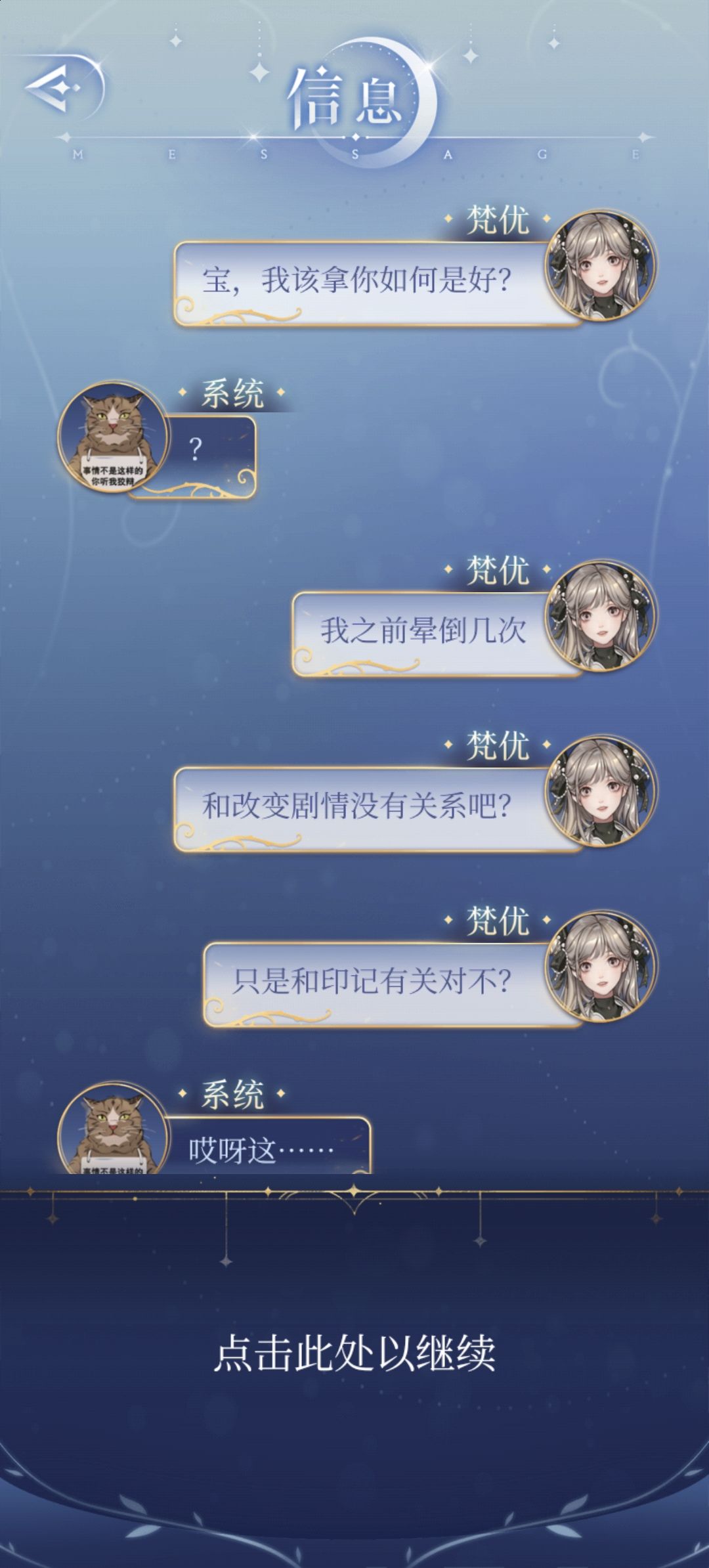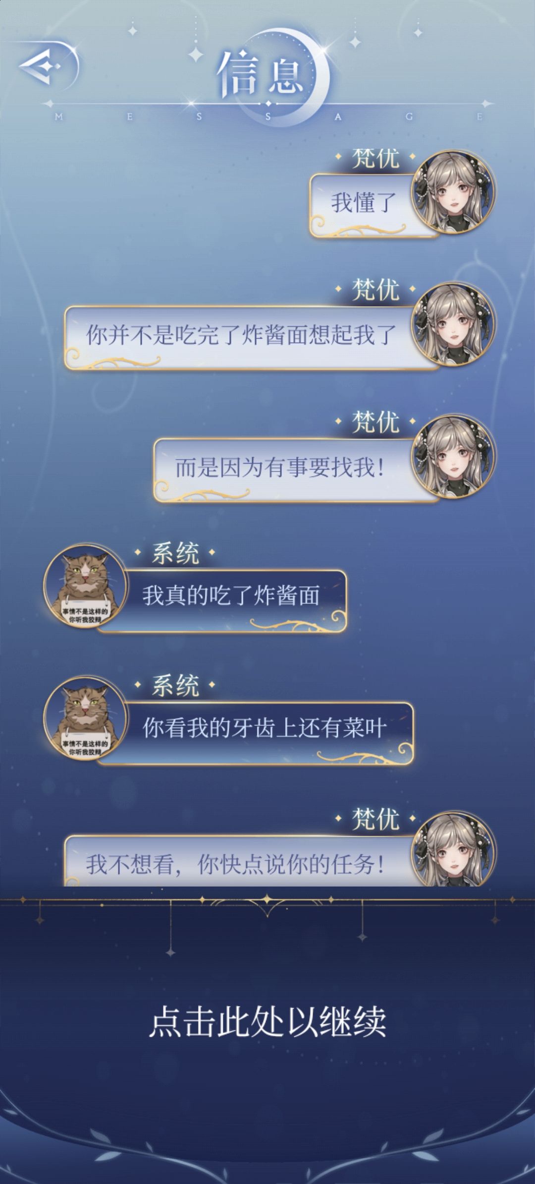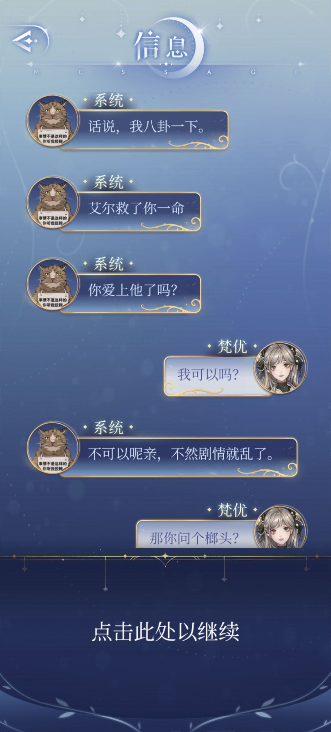 梵优经常调侃系统,比如称呼它为“破猫”、“骗子猫”,甚至质疑它作为系统的合法性(“你只是一个系统好吗?”)。系统则以幽默和略带吐槽的方式回应,比如自称“可爱的小猫咪”,或者用哲学系毕业的背景来回击梵优的质疑。这种互相调侃的模式是他们互动的主要形式,充满了轻松和幽默。