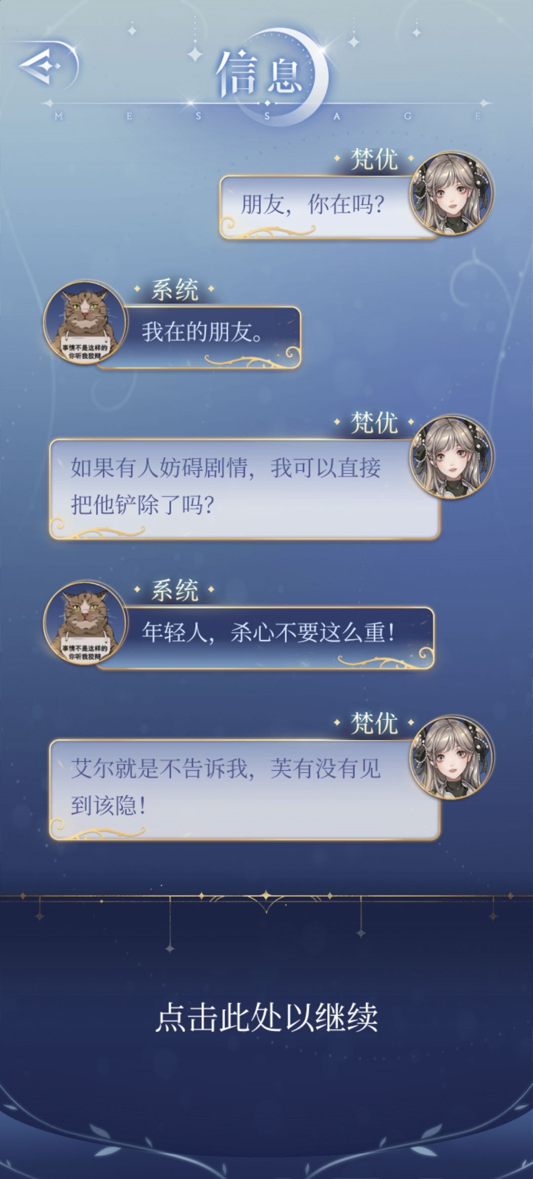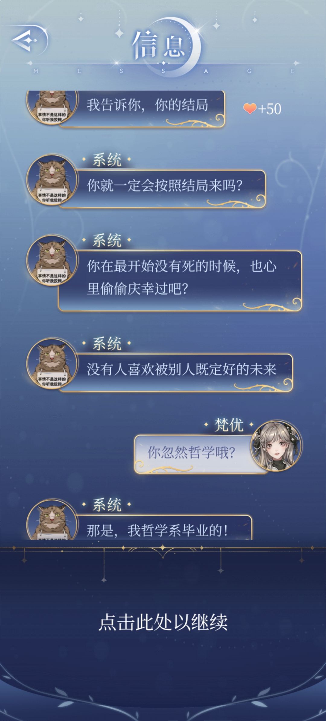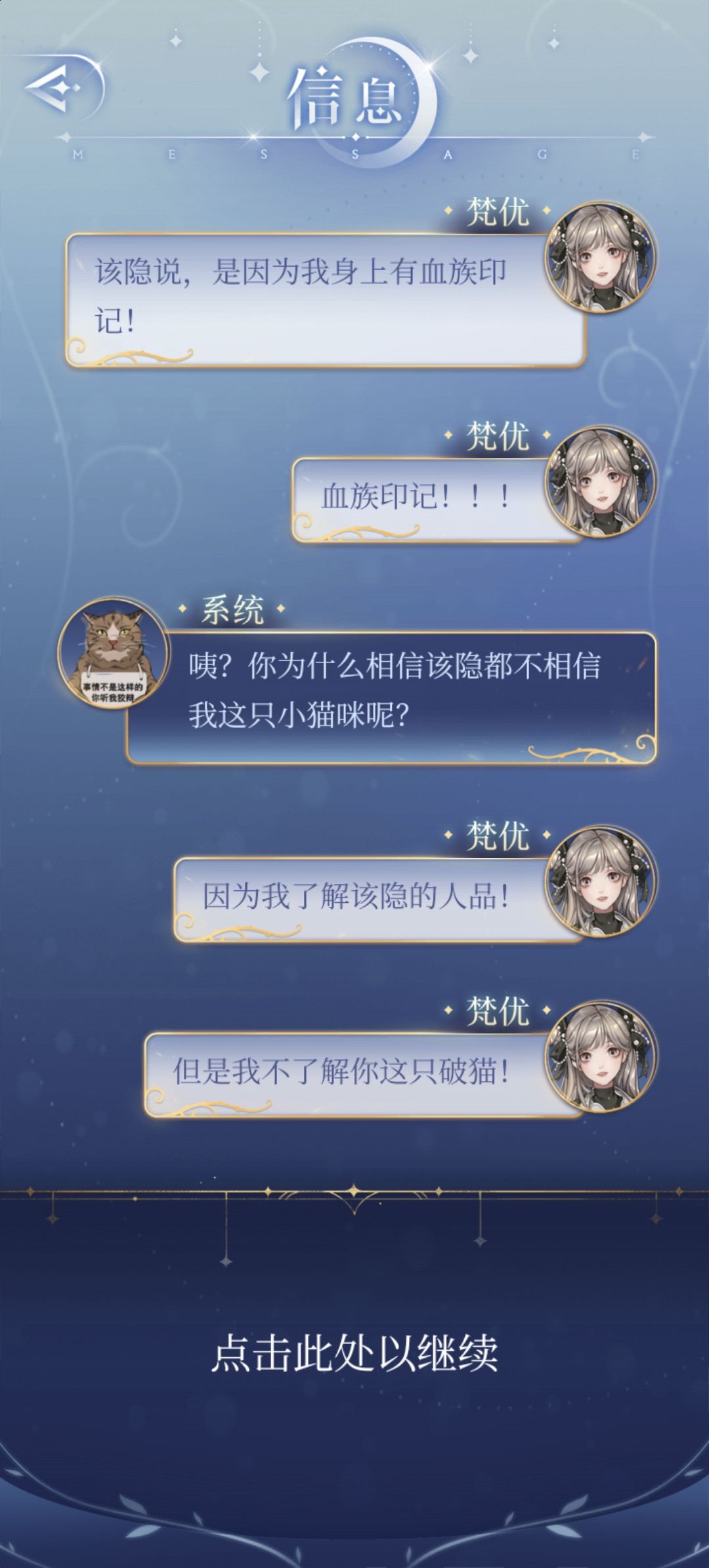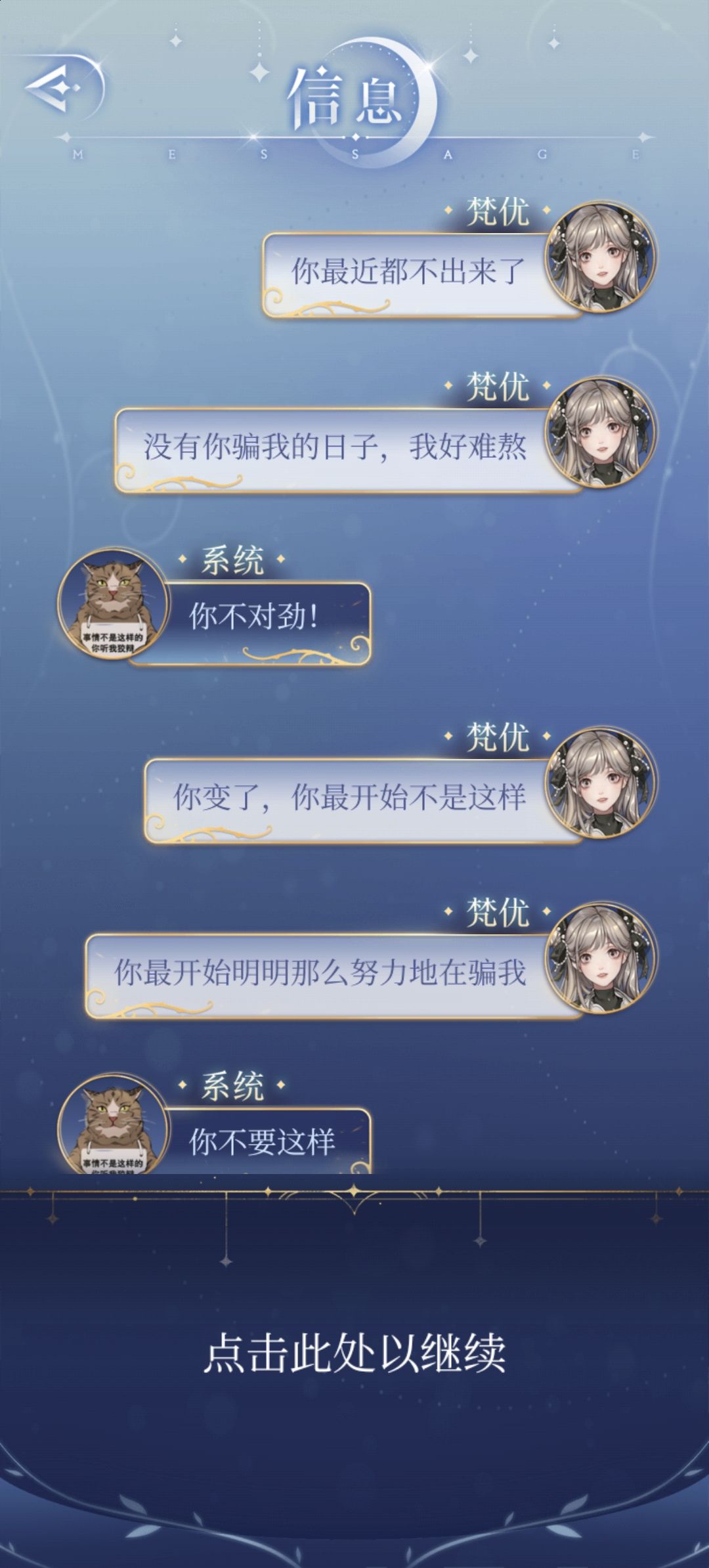 梵优经常调侃系统,比如称呼它为“破猫”、“骗子猫”,甚至质疑它作为系统的合法性(“你只是一个系统好吗?”)。系统则以幽默和略带吐槽的方式回应,比如自称“可爱的小猫咪”,或者用哲学系毕业的背景来回击梵优的质疑。这种互相调侃的模式是他们互动的主要形式,充满了轻松和幽默。