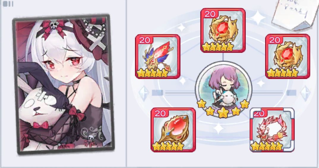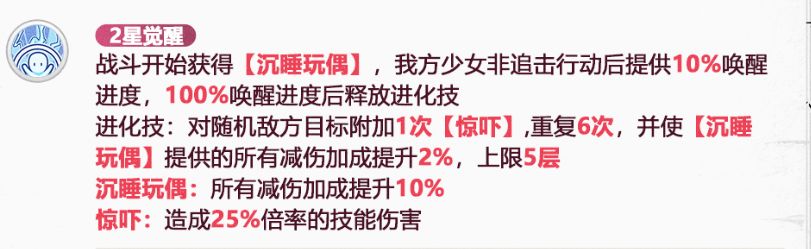 战斗开始获得【沉睡玩偶】,我方少女非追击行动后提供10%唤醒进度,100%唤醒进度后释放进化技,进化技:对随机敌方目标附加1次【惊吓】,重复6次,并使【沉睡玩偶】提供所有减伤加成提升2%,上限5层;