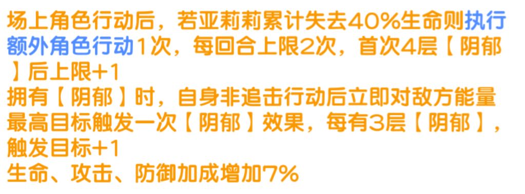 场上角色行动后,若亚莉莉累计失去40%生命则执行额外角色行动1次,每回合上限2次,首次4层【阴郁】后上限+1,拥有【阴郁】时,自身非追击行动后立刻对敌方能量最高的目标触发一次【阴郁】效果,每有3层【阴郁】,触发目标+1