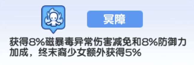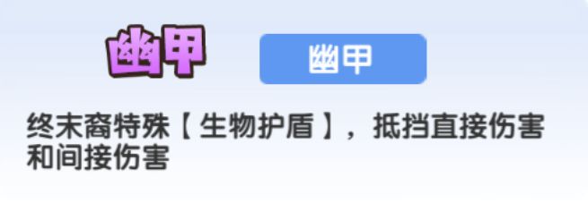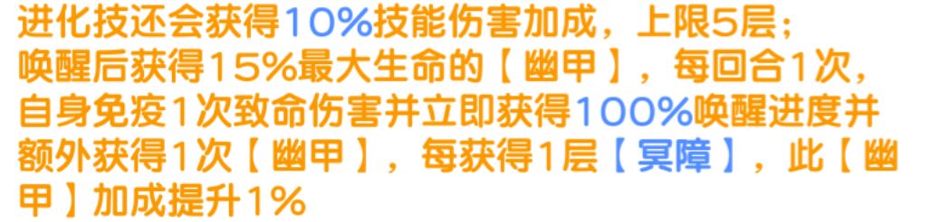 进化技还会获得10%技能伤害加成,上限5层;唤醒后获得15%最大生命的【幽甲】,每回合1次,自身免疫1次致命伤害并立刻获得100%唤醒进度并额外获得1次【幽甲】,每获得1层【冥障】,此【幽甲】加成提升1%