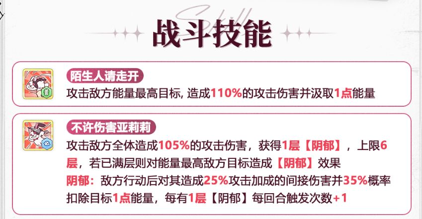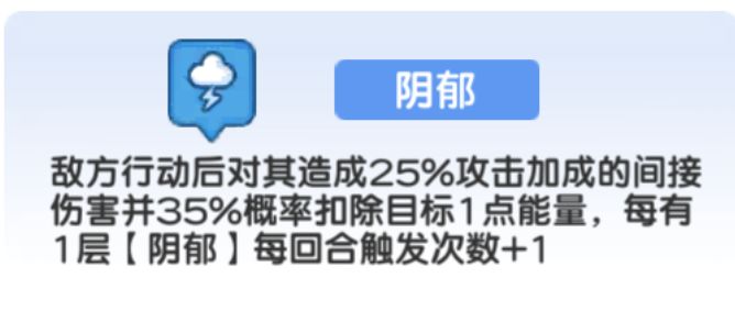 阴郁:敌方行动后对其造成25%攻击加成的间接伤害并35%概率扣除目标1点能量,每有1层【阴郁】每回合触发次数+1