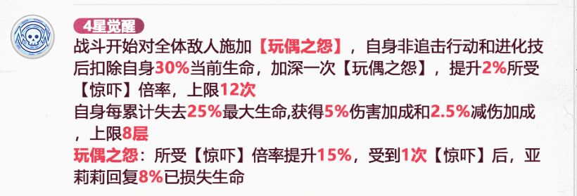 战斗开始对全体敌人施加【玩偶之怨】,自身非追击行动和进化技后扣除自身30%当前生命,加深一次【玩偶之怨】,提升2%所受【惊吓】倍率,上限12次