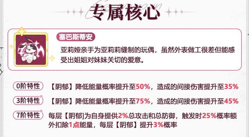 专属核心围绕着【阴郁】来进行的,增加【阴郁】降低能量的概率,以及增加所造成的间接伤害,达到7阶之后,若自身【阴郁】层数达到满层6层,则会有43%概率额外扣除目标1点能量