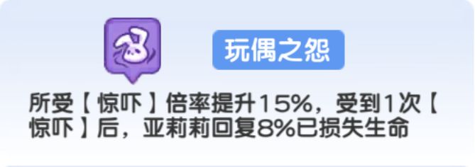 1、【玩偶之怨】可以使敌方收到【惊吓】的倍率提升15%,并且敌方受到1次【惊吓】后,亚莉莉回复8%已损失生命
