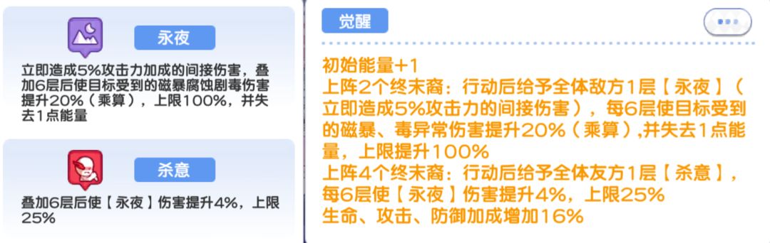 这边主要提到了两个buff,【永夜】和【杀意】,其中【永夜】造成间伤,并让敌方受到磁暴腐蚀剧毒的伤害提升20%,并且失去能量,【杀意】使【永夜】的伤害提升