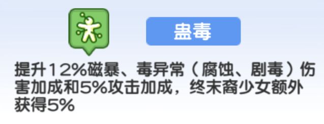 心向——无尽的力量,让亚莉莉获得了挂剧毒的能力,当【阴郁】达到满层6层之后,释放技能有68%的概率施加剧毒,搭配卡莲给予的buff【蛊毒】可以使其剧毒伤害额外提升2%,【蛊毒】上限7层,最多能额外增加14%的剧毒伤害