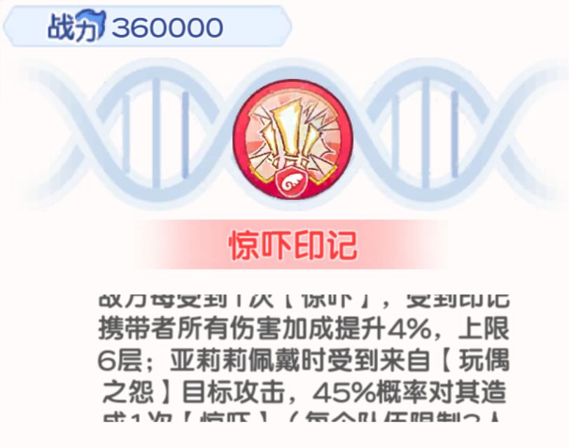 2、亚莉莉受到来自【玩偶之怨】目标攻击时,有45%的概率对其造成1次【惊吓】,通过挨打从而让敌方受到1次【惊吓】算得上锦上添花吧