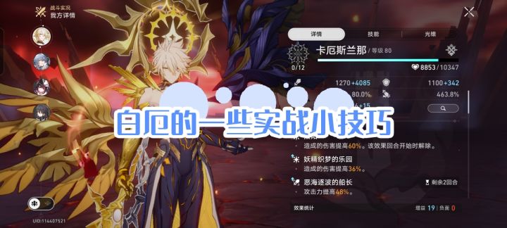 其次,白垩开启大招之后的回合数算作额外回合,因此,当你的最核心的那项增益buff持续时间只剩一回合的时候白厄要优先开大,开大之后的8个额外回合那项buff都会持续(此外,白厄还可以使是加在自己身上的buff额外持续一个回合)。我方存护角色和丰饶角色对白厄施加盾或奶,也会使其获得额外的增伤效果。
