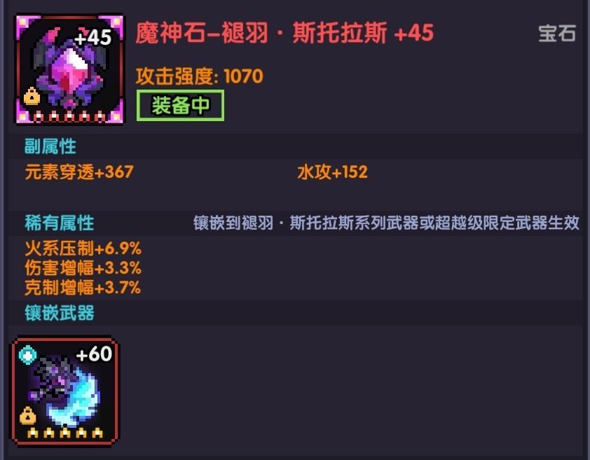 副属性:9元穿,7水攻2爆伤/6水攻3爆伤,水攻可以适当洗多一点,不过还是哪个更接近最高值用哪个