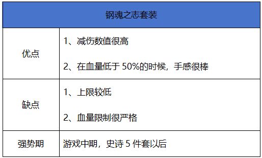 如果不考虑目前比较bug的两套装备,钢魂之志套装绝对是大部分玩家的首选套装,钢魂之志套装的生存能力不用多说,在血量低于50%的时候,还会激活霸体效果,另外5件套还会追加15%的速度增加效果,完美搭配当前版本的狂战士,并且这套装备的攻击加成还不低,套装技攻收益为75.5%,达到了主c套装的输出数据