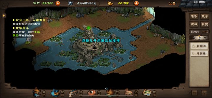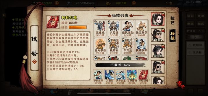 开第五秘技流程好长,先把主线推到樊语传功,再完成奇人庄疑案,龙争虎斗下至云坛峰,每个人开秘技还需要1800点真气。