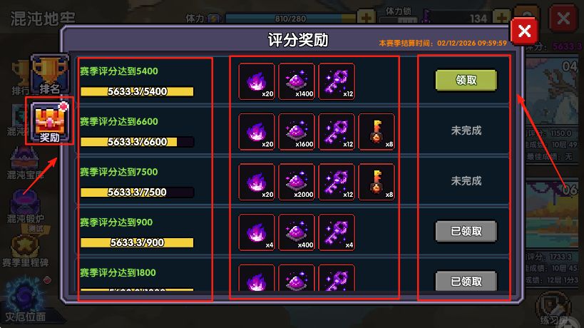 地图评分,限时内通关混沌地牢副本获得,并且每张地图达到指定分数后可领取对应奖励。