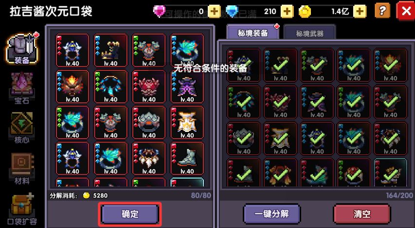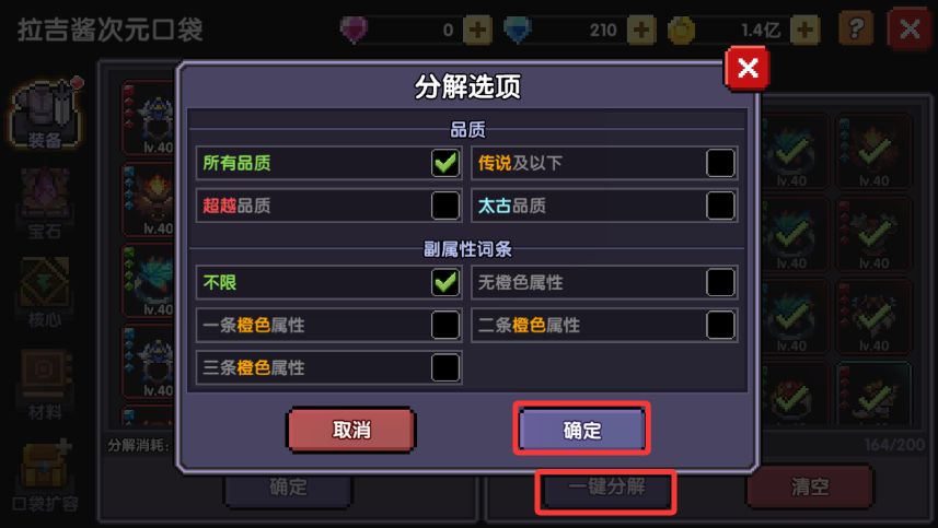 打开拉吉酱次元口袋,一键分解,确定,确定。