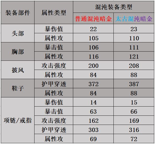 太古混沌暗金具有以下优势基础属性略优混沌特性必定为Lv3基础特性必定3条且总等级为6或7(基础特性总等级7又称为毕业太古胚子)、属攻转换为全能属攻(根据符文结晶页激活情况自动转换对应属性攻)及可太古重铸(重铸后三系通用,位置:符文-太古重铸