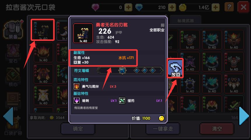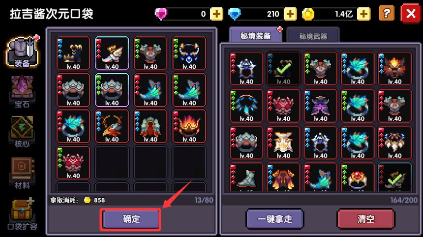 勇者们通关混沌地牢后,无需手动拾取所掉落的装备直接退出即可装备会被拉吉酱自动拾取,在拉吉酱中方便我们进行筛选等系列操作。
