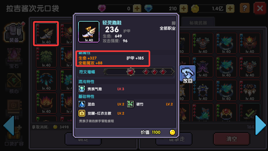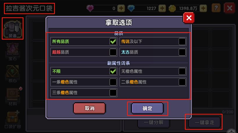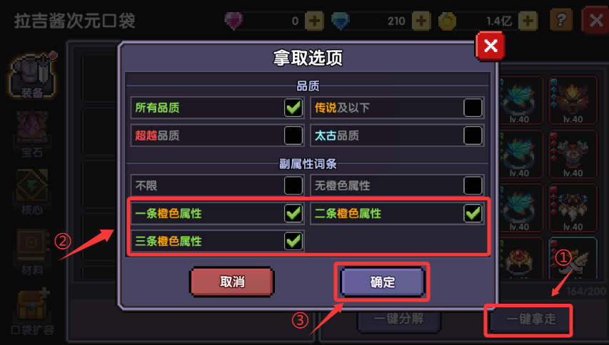 一键拿走,取消勾选"混沌特性等级-LV3",勾选"副属性词条-一条、两条、三条橙色属性",确定,从一键拿走区域再次筛选合适的装备进行保留(附各部件lv.40满属性图),确认,打开背包将混沌耗材装备放入仓库2。