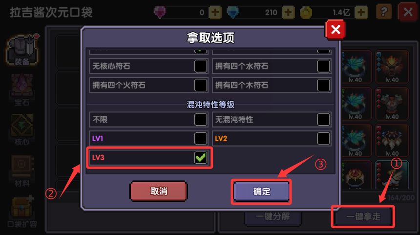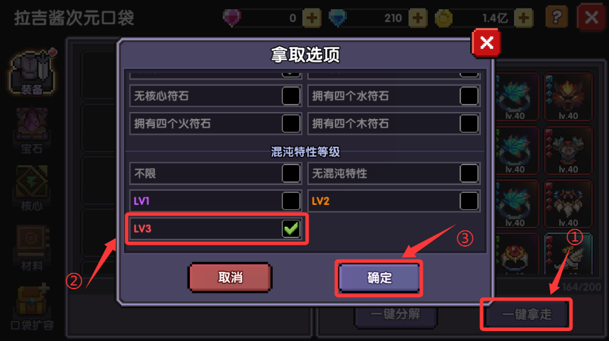 一键拿走,下滑选项并勾选"混沌特性等级-LV3",确定,确定,打开背包将Lv3混沌特性装备放入仓库1。