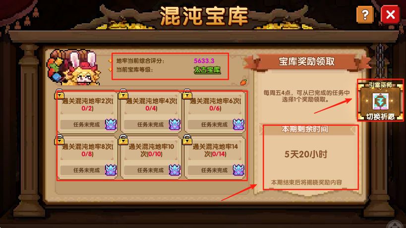 混沌宝库,更新于六周年版本-武侠主题-上官(2025.07.09),完成任务解锁选择,必定出现祈愿混沌暗金套装保证全部部位都出现(前提:完成足够数量的任务)。当综合评分3450(3张地图3星通关第10层)及以上时,必出太古混沌暗金,每周五4点开奖及重置。