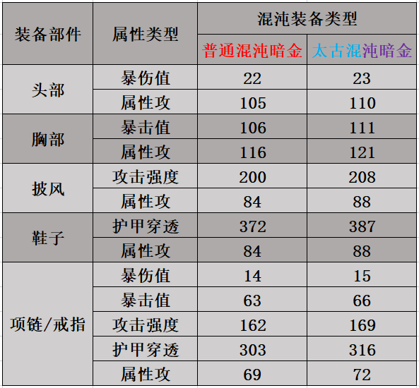 太古混沌暗金具有以下优势:基础属性略优、混沌特性必定为Lv3、基础特性必定3条且总等级为6或7(基础特性总等级7又称为毕业太古胚子)、属攻转换为全能属攻(根据符文结晶页激活情况自动转换对应属性攻)及可太古重铸(重铸后三系通用,位置:符文-太古重铸)。