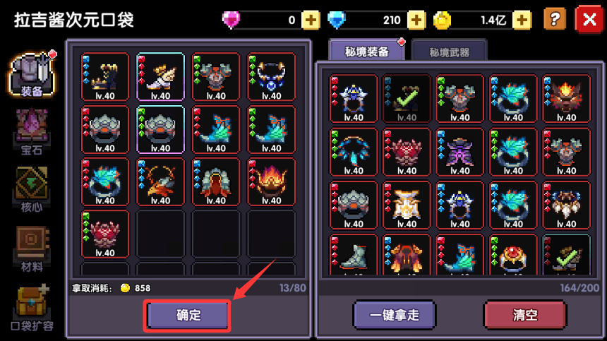 勇者们通关混沌地牢后,无需手动拾取所掉落的装备,直接退出即可,装备会被拉吉酱自动拾取,在拉吉酱中方便我们进行筛选等系列操作。