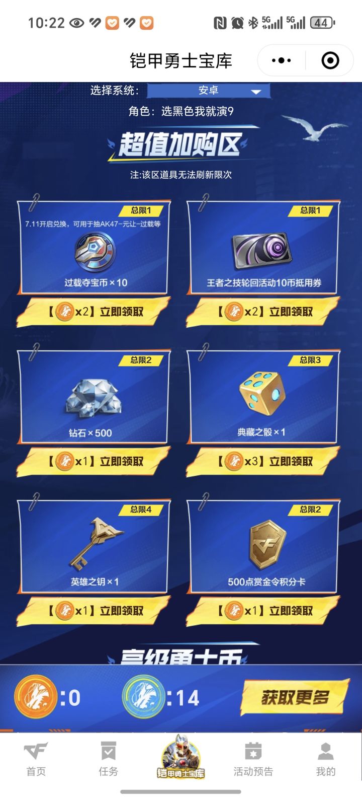 回流玩家或新玩家填写口令码:cfmfp3p3,有概率获得一把永久金V,高级币可以兑换三把英雄之钥和王者之辉扭蛋机夺宝抽奖币10个