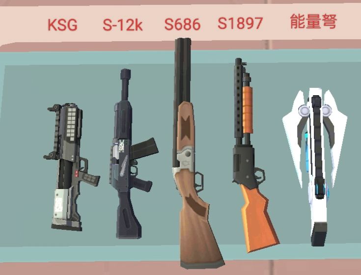 众所周知,香肠派对一共有5把霰弹枪,分别为KSG,S12K,S686,S1897,能量弩(如图)