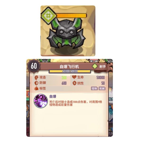 自爆:死亡后对周围9格怪物造成自身攻击力×90倍伤害