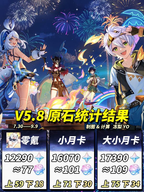 来咯!5.8版本可获原石统计,此次冻梨依旧将其划分为了“零氪、月卡、大小月卡”三种数量最多的玩家类型,并分别预估了上下半可获取量。其中部分纠缠之缘也已经转化为了160原石,让呈现的结果更直观一些~