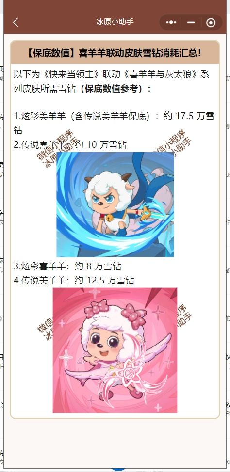 快来当领主保底数值-喜羊羊联动皮肤雪钻消耗汇总!