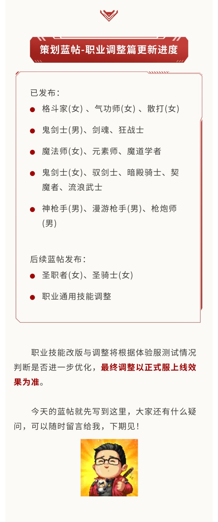 之前的蓝帖已经介绍了格斗家/气功师/散打、男鬼剑士/剑魂/狂战士、女魔法师/元素师/魔道学者和女鬼剑士各转职的技能调整,感兴趣的勇士们可以到主页回顾看看,下一篇女圣职者/圣骑士的技能改版也会尽快发出。